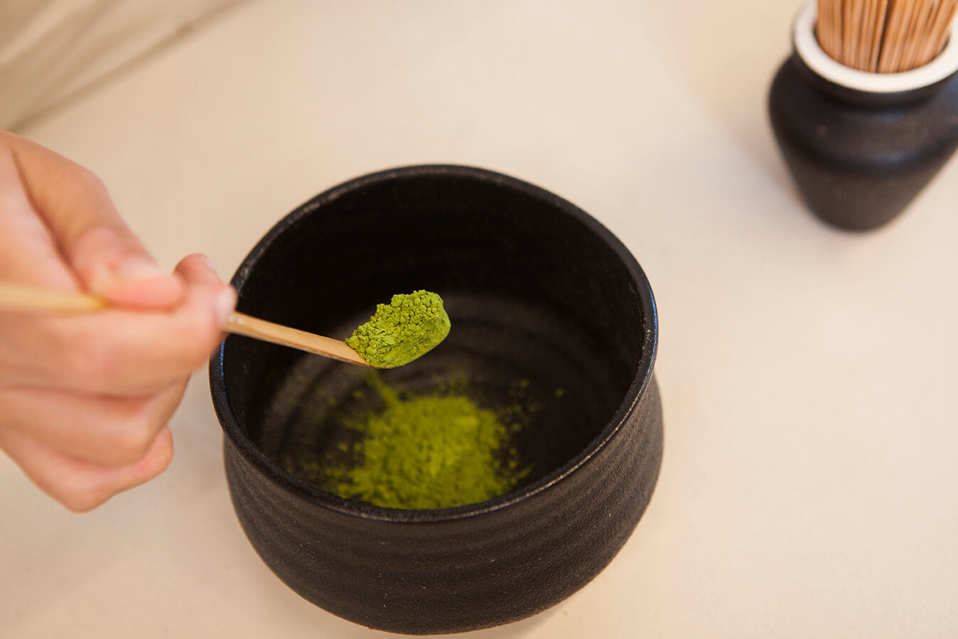 2. שמים בתוך הקערה 2.5 גרם אבקת מאצ׳ה, בוחשים באמצעות הבוחשן המיועד עד לקבלת מרקם אחיד